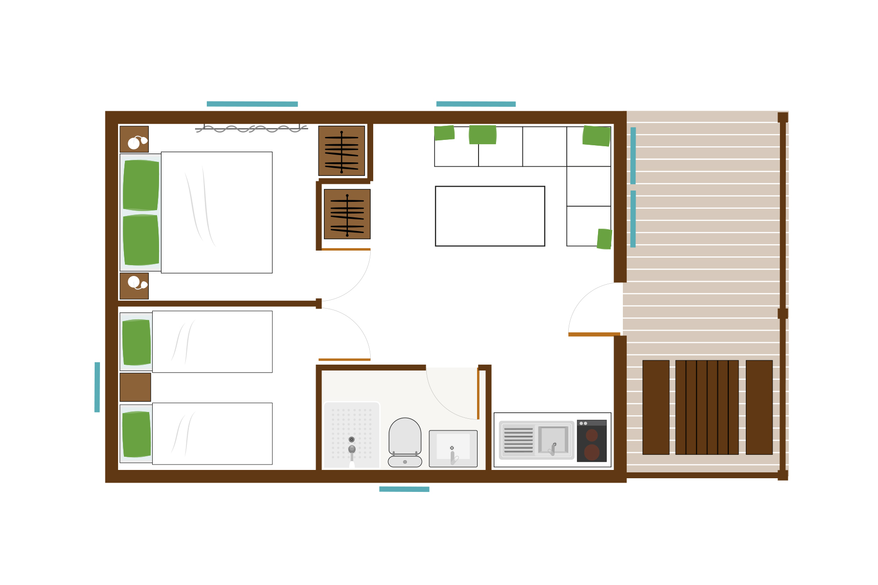 De Natura Bungalow voor 4 personen en zonder vide heeft geen trappen en is ideaal voor gezinnen met kleine kinderen. Volledig gebouwd in hout en met 2 tweepersoonsslaapkamers en een grote buitenveranda.