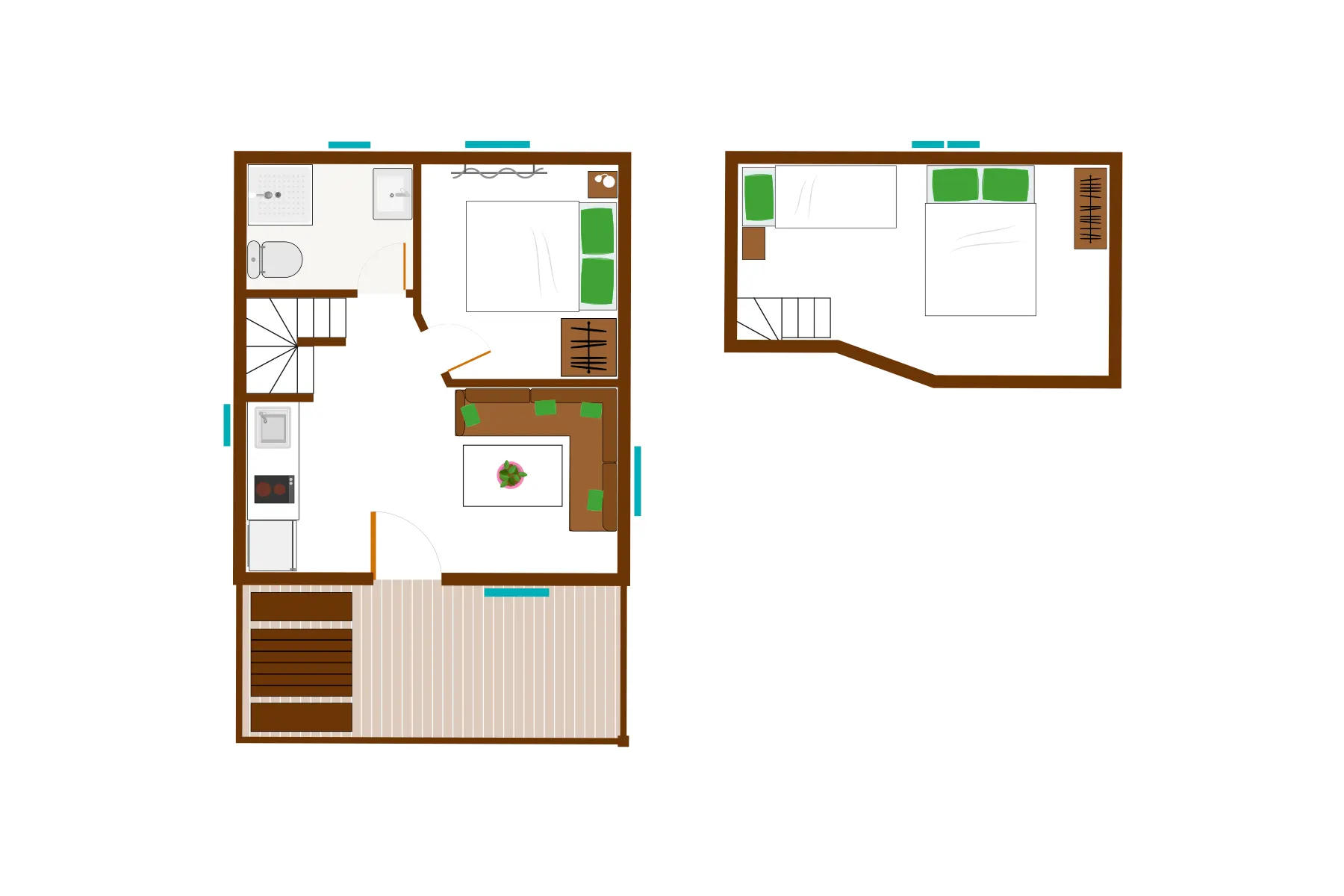De houten bungalow voor 4 personen bestaat uit één verdieping.2